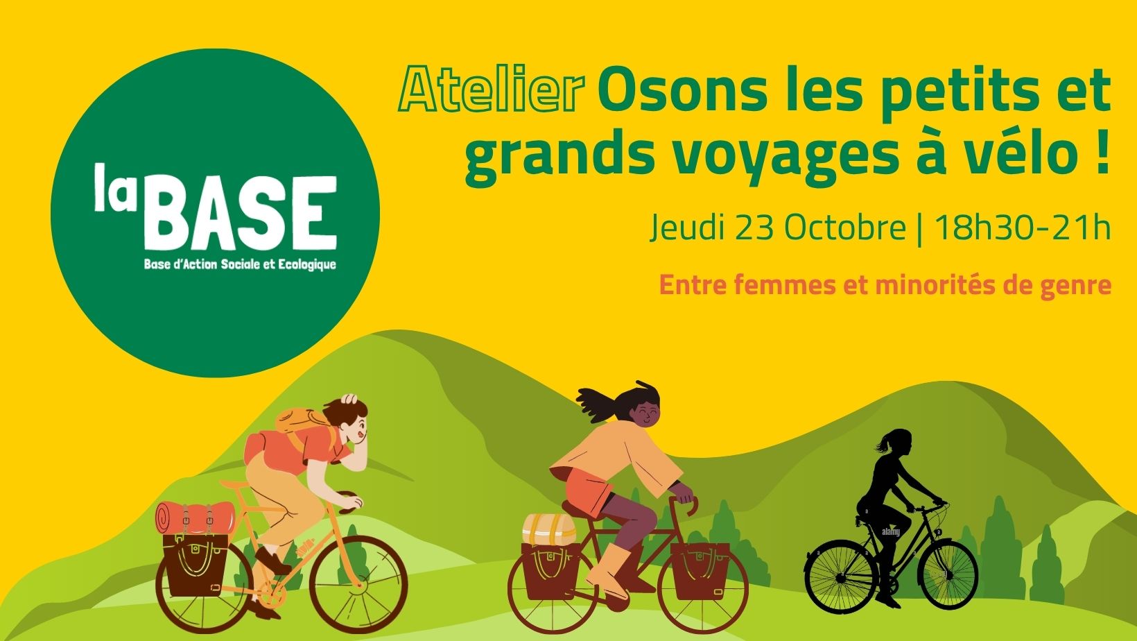 🚵 Que ce soit pour une journée, un week-end, une semaine ou plus, partir sur la petite reine quand on est une femme, ça peut faire peur. Comment dépasser ces craintes et enfin oser se mettre en selle? Cet atelier va vous donner toutes les cartes en main pour vous lancer avec confiance. Si vous avez déjà tenté l’aventure, vous êtes également les bienvenu-e-s